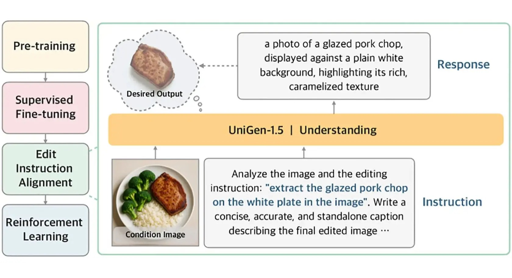 برای حل این مشکل، UniGen 1.5 از مرحلهای جدید پس از آموزش نظارتشده (Post-SFT) به نام Edit Instruction Alignment استفاده میکند. در این مرحله، مدل ابتدا تصویر اولیه و دستور ویرایش را دریافت و سپس تلاش میکند توصیف متنی دقیقی از تصویر نهایی تولید کند؛ توصیفی که محتوای معنایی تصویر ویرایششده را مشخص میکند.