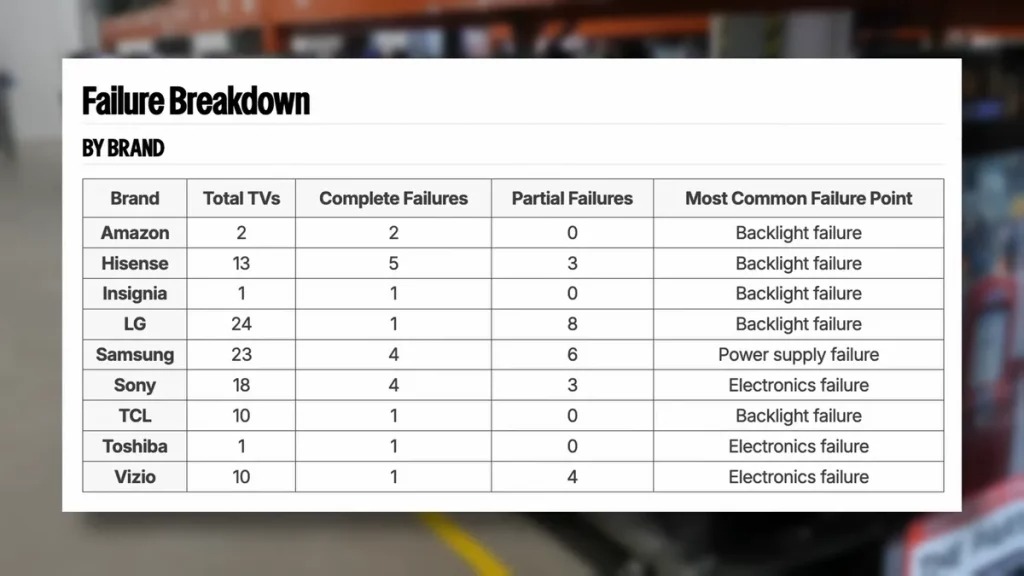 یکی از مهم‌ترین دغدغه‌های کاربران هنگام خرید تلویزیون، دوام و پایداری است، زیرا کاربران انتظار دارند دستگاهشان سال‌ها بدون مشکل کار کند. داده‌های بررسی RTING نشان می‌دهد که ال‌جی و TCL در این زمینه بهترین عملکرد را دارند؛ از مجموع 24 تلویزیون LG تنها یک دستگاه به‌طور کامل خراب شد و از میان 10 تلویزیون TCL تنها یک مدل درست قبل از پایان آزمایش از کار افتاد.
