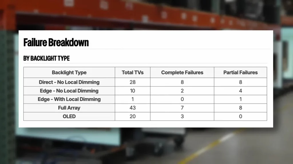 بررسی بخش نور پس‌زمینه نشان می‌دهد که عدم وجود نور پس‌زمینه در OLEDها باعث افزایش دوام شده است. در میان مدل‌های LCD بیشترین خرابی مربوط به آرایه‌های LED نور لبه بود، زیرا مسیر هدایت نور یک آسیب‌پذیری رایج است و معمولاً حداقل یک LED از کار می‌افتد. در برخی تلویزیون‌ها، این مشکل باعث ازکارافتادن ردیفی از LEDها یا حتی کل نور پس‌زمینه می‌شود. تقریباً 60 درصد تلویزیون‌های بدون Local Dimming دچار خرابی کامل یا جزئی شدند، درحالی‌که تلویزیون‌های دارای Full-Array Local Dimming مانند مدل‌های Mini-LED عملکرد بهتری داشتند، هرچند حدود 25 درصد آنها نیز مشکلاتی را تجربه کردند.