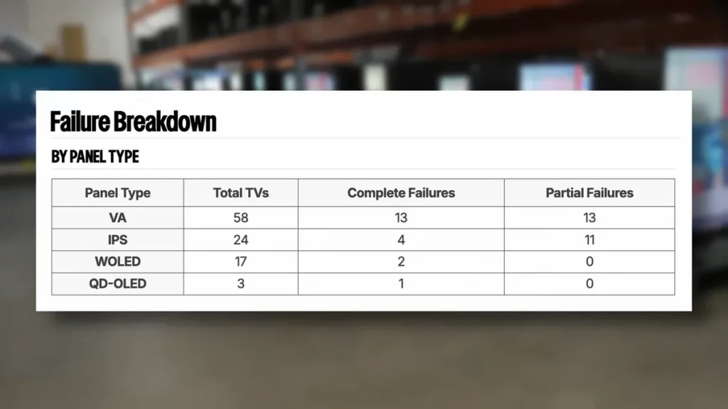 نتایج آزمایش‌ها نشان می‌دهد که پنل‌های OLED در مقایسه با سایر انواع پنل‌ها، بیشترین دوام را دارند و تنها تحت فشار شدید دچار سوختگی تصویر شدند. در سوی دیگر، پنل‌های IPS عملکرد ضعیف‌تری داشتند و 15 مدل از 24 مدل دچار خرابی شدند که دلیل اصلی آن نبود Local Dimming و تأثیر مستقیم نور پس‌زمینه است.