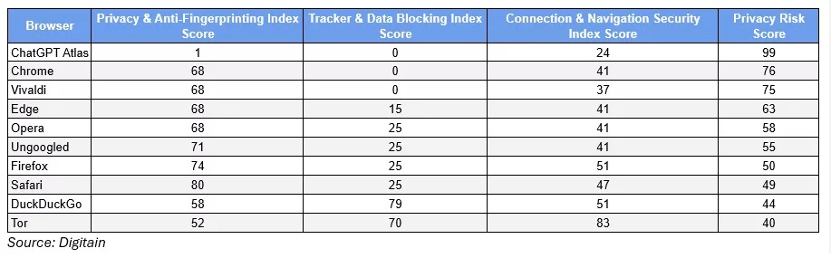 مرورگر ChatGPT Atlas بدترین رتبه را در این ردهبندی کسب کرده است.