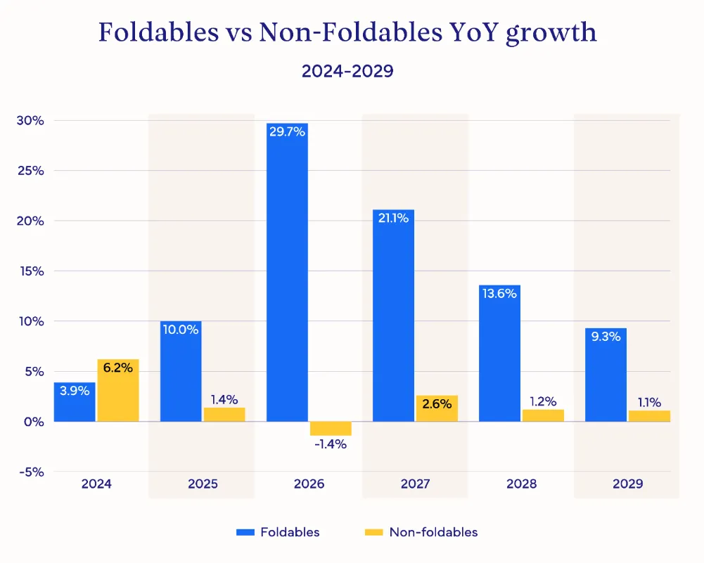 گوشیهای تاشو تا سال ۲۰۲۹ با نرخ رشد مرکب سالانه ۱۷ درصد رشد خواهند کرد، در حالی که رشد بخش گوشیهای هوشمند سنتی کمتر از ۱ درصد خواهد بود.