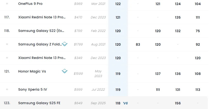 این گوشی که بهعنوان نسخه اقتصادیتر گلکسی S25 معرفی شده، با قیمت 499 دلار برای مدل 128 گیگابایتی عرضه میشود. براساس ارزیابی DxOMark، گلکسی S25 FE توانسته تنها 118 امتیاز کسب کند و در ردهبندی جهانی این سایت در جایگاه 123 قرار گیرد. این امتیاز نشان میدهد که عملکرد دوربین این گوشی حتی از دستگاههای قدیمیتر و ارزانتر مانند آیفون 12 پرو مکس، آیفون 13 و گوگل پیکسل 6a که هرکدام 122 امتیاز دارند، پایینتر است.