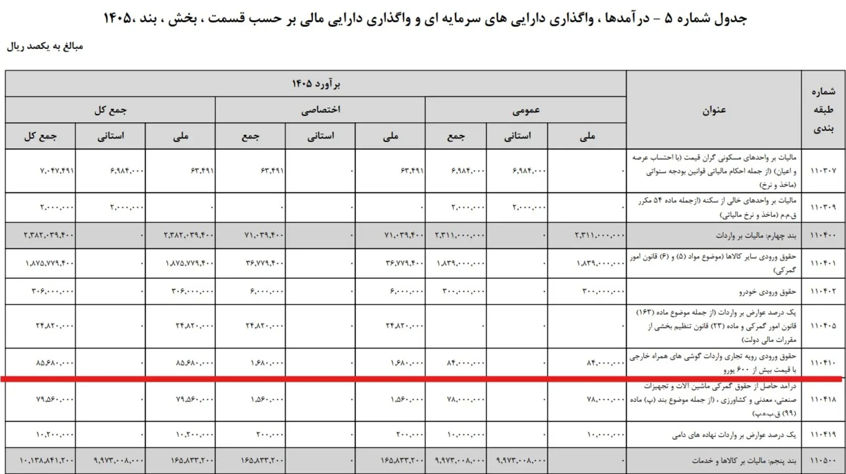دولت پیشبینی کرده است که در سال ۱۴۰۵، مجموعاً ۸.۵ همت از محل حقوق ورودی گوشیهای بالای ۶۰۰ یورو درآمد داشته باشد. این عدد سال گذشته ۴.۹ همت برآورد شده بود.