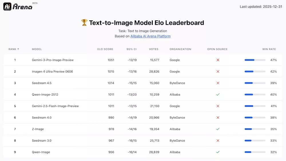 در تستهای انجام شده روی AI Arena علیبابا، Qwen-Image-2512 بهعنوان قدرتمندترین مدل متنباز تصویر رتبهبندی شده و در رقابت با سیستمهای بسته نیز عملکرد نزدیکی داشته است.