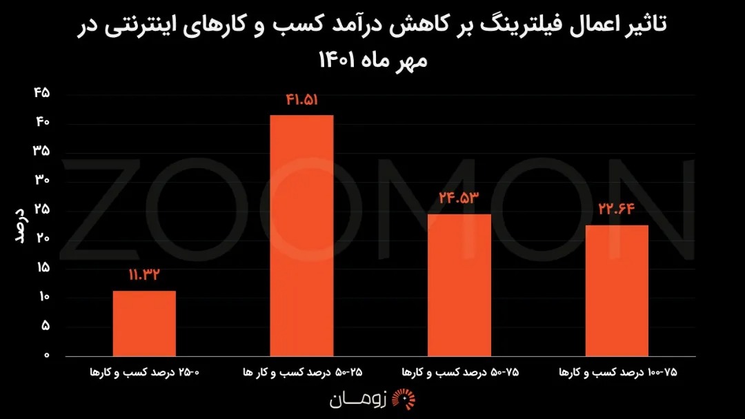 علاوه بر ضررهای مستقیم ناشی از اختلال در تراکنشهای مالی، فیلترینگ باعث افت شدید درآمد کسبوکارها شده است. بر اساس نظرسنجیهای انجام شده، حدود نیمی از کسبوکارها بیش از 50 درصد از درآمد خود را در هنگام محدودیت اینترنت در سال 1401 از دست دادهاند.