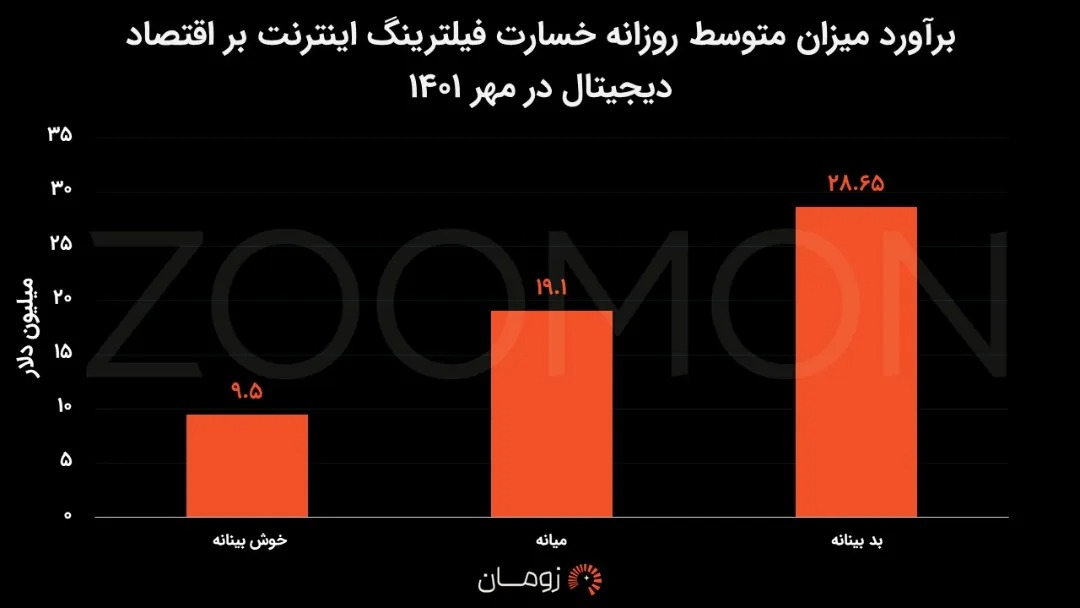 پایگاه دادههای باز ایران، سه سناریو برای محاسبه آسیبهای روزانه فیلترینگ ارائه داده است: خوشبینانه، میانه و بدبینانه. با سهم اقتصاد دیجیتال از تولید ناخالص داخلی که 7.2 درصد بود، در سناریوی بدبینانه که تورم 40 درصدی در آن سال لحاظ شده، آسیب روزانه به 28.27 میلیون دلار میرسد. با در نظر گرفتن تورم 50 درصدی و رشد سهم اقتصاد دیجیتال از تولید در این سال ها، این رقم میتواند به 35 میلیون دلار در روز نیز برسد.