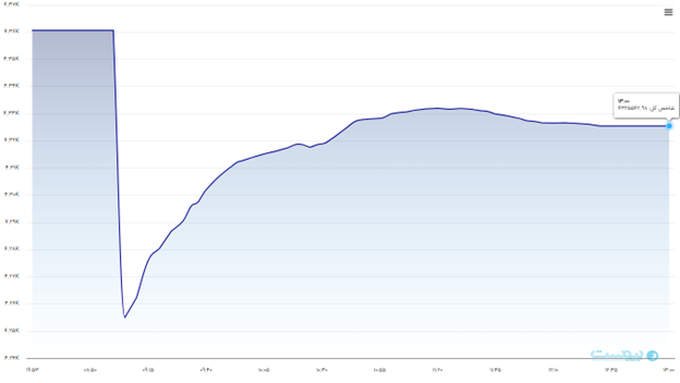 شاخص کل بورس پس از تشدید انواع محدودیتهای ارتباطی در نخستین روز هفته با افت ۰.۸۱ درصدی در کانال ۴ میلیون و ۳۲۵ هزار واحد قرار گرفت. حدود ۹۵ درصد سهامداران در صف فروش ایستادند.