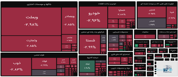 شاخص کل فرابورس نیز در این روز با افت ۱.۸۳ درصدی به ۳۳ هزار و ۸۰۴ واحد رسید. شاخص کل هموزن فرابرس هم افت ۲.۲۹ درصدی را بهثبت رساند.