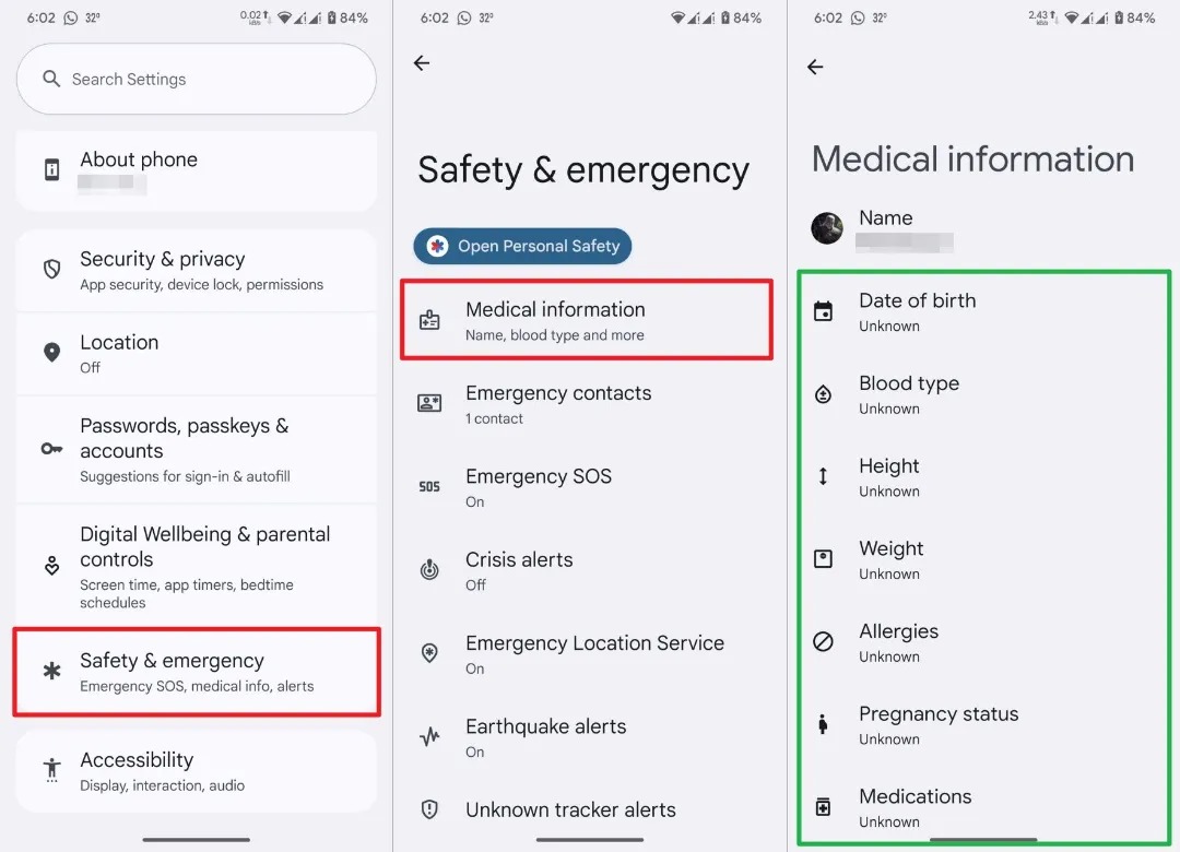 اندروید در نسخههای جدید خود ساختاری نسبتاً یکپارچه تحت عنوان «Safety & Emergency» برای ثبت اطلاعات پزشکی و اضطراری ارائه میدهد. البته مسیر دسترسی به این قابلیت در برندهای مختلف ممکن است اندکی متفاوت باشد. در تمام مدلها، هدف یکسان است: ثبت اطلاعاتی که در صفحهی قفل و بدون نیاز به باز کردن گوشی در دسترس امدادگران قرار گیرد.