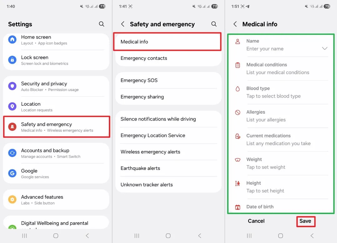 در شرایط اضطراری، دسترسی سریع به اطلاعات پزشکی فرد میتواند نقش حیاتی در حفظ جان او داشته باشد. گوشیهای هوشمند امروزی، چه اندرویدی و چه آیفون، قابلیتی برای ذخیرهی اطلاعات پزشکی و تماسهای اضطراری ارائه میدهند که حتی در حالت قفل بودن گوشی نیز قابل مشاهده است.