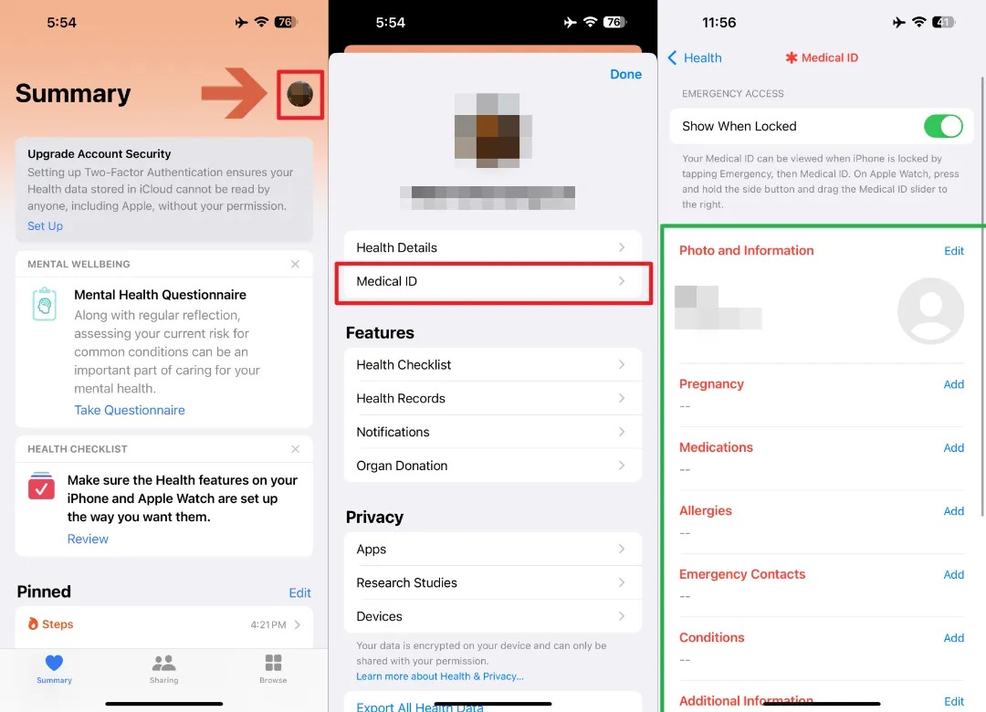 در آیفون، اپلیکیشن Health بهصورت پیشفرض برای مدیریت اطلاعات سلامت طراحی شده است. درون این اپلیکیشن، بخشی به نام Medical ID وجود دارد که به کاربران امکان میدهد اطلاعات پزشکی ضروری خود را ذخیره کنند. این اطلاعات از طریق صفحهی قفل و بدون باز کردن گوشی در دسترس خواهد بود.