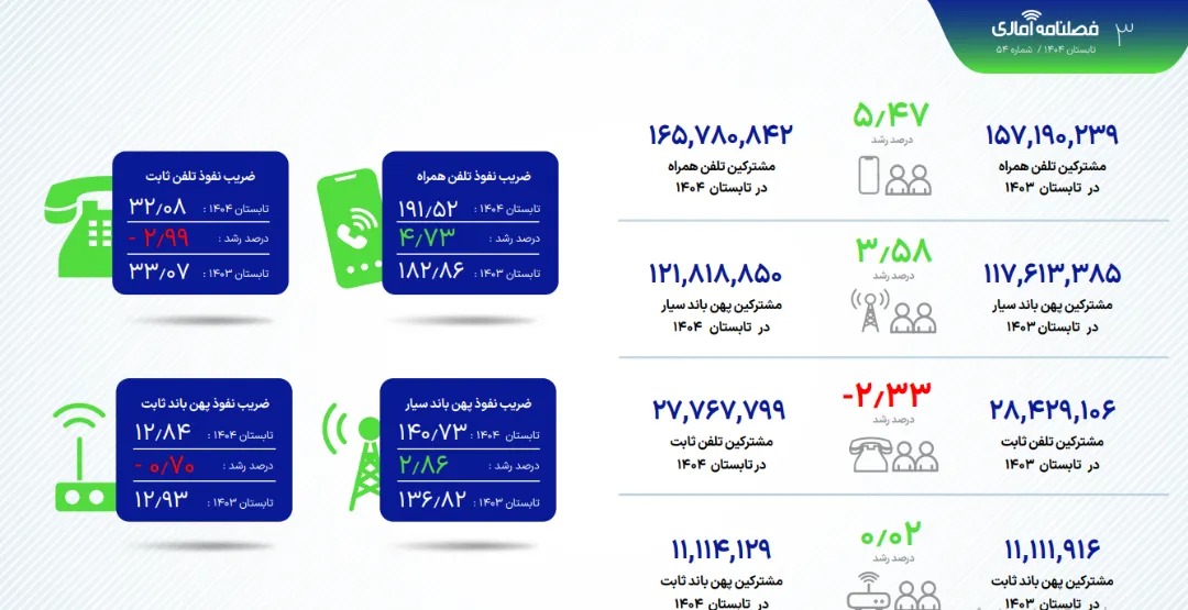 بر اساس این گزارش، ضریب نفوذ تلفن همراه در کشور با رشدی محسوس نسبت به تابستان ۱۴۰۳ از ۱۸۲ درصد به بیش از ۱۹۰ درصد رسیده است. میزان کاربران این شبکه بیش از ۱۶۵ میلیون نفر هستند یعنی حدود دو برابر جمعیت کشور. با وجود رشد نسبتا ۵ درصدی ضریب نفوذ موبایل، ضریب نفوذ تلفن ثابت اما کما فی‌السابق با کاهش همراه شده که نشان‌دهنده افول ادامه‌دار این سرویس سنتی است.