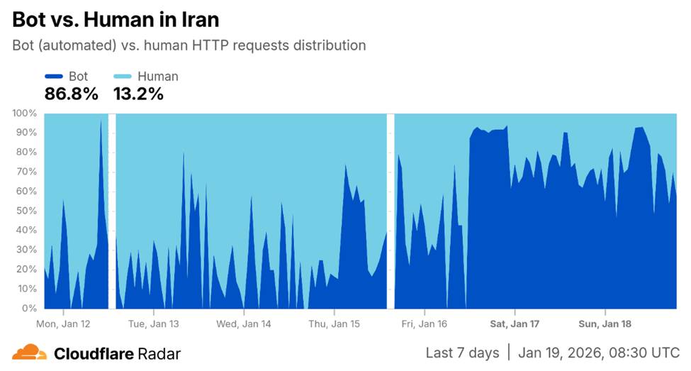 همچنین طبق گزارش کلادفلر، نسبت ترافیک باتها به انسانها در حال افزایش است که نشان میدهد از روز یکشنبه، ۲۸ دی ۱۴۰۴، کاربران نسبتا بیشتری توانستهاند از ویپیان استفاده کنند. با این حال، این روند ادامه پیدا نکرد و اینترنت امروز، حتی نسبت به روز گذشته، پراختلالتر است.