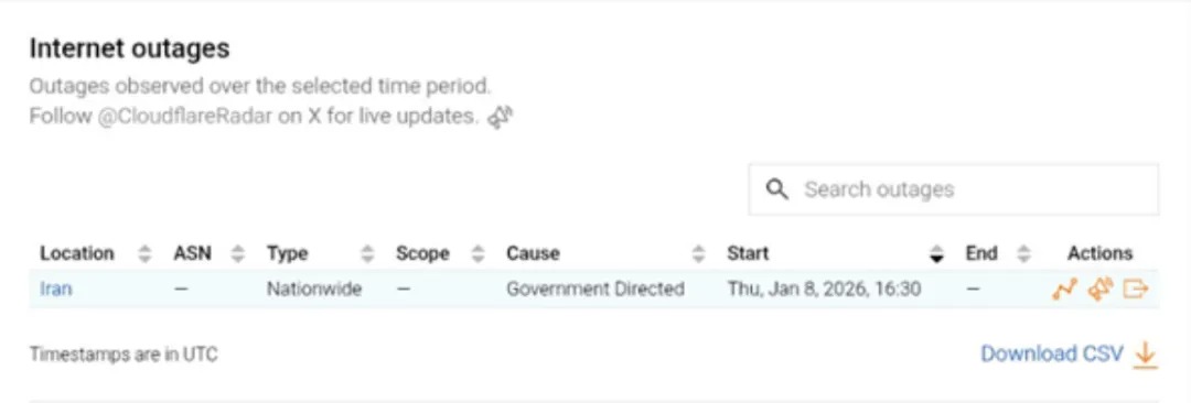 بر اساس آخرین گزارش کلودفلر که قبل از قطعی اینترنت میشد به آن دسترسی داشت، از روز پنجشنبه هجدهم دی ماه میزان آدرسدهی پروتکل اینترنت نسخه شش (IPv6) در ایران حدود ۹۸.۵ درصد کاهش یافت.