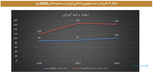 جایگاه ایران در شاخص توسعه دولت الکترونیکی (EGDI) در سال ۲۰۲۴ در مقایسه با ۲۰۲۲ با ۱۰ پله سقوط به رتبه ۱۰۱ در میان ۱۹۳ کشور جهان رسیده است.