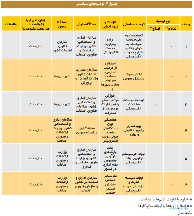 مرکز پژوهشها پیشنهادهایی سیاستی برای تقویت اکوسیستم دولت الکترونیکی و هوشمند در ایران مبتنی بر وضعیت کشور در شاخص EGDI ارائه داده است. از جمله این پیشنهادها عبارتند از: «توسعه پنجره ملی خدمات هوشمند به عنوان پلتفرم یکپارچه دولت الکترونیکی»، «ارتقای سواد دیجیتال عمومی»، «توسعه سیستم مشارکت الکترونیک شهروندان»، «بهینهسازی چارچوب قانونی و نهادی»، «ایجاد اکوسیستم نوآوری دولت الکترونیکی»، «ایجاد سیستم نظارت و ارزشیابی دولت الکترونیکی».
