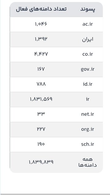 بر اساس آخرین اعلام مرکز ثبت دامنه کشوری، تاکنون یک میلیون و ۸۳۹ هزار و ۸۳۹ دامنه فعال فارسی به ثبت رسیده که در این میان دو پسوند داتآیآر (ir.) و co.ir بیشترین دامنه فعال را دارند.