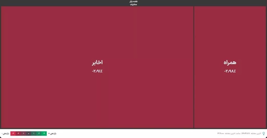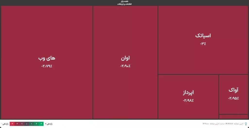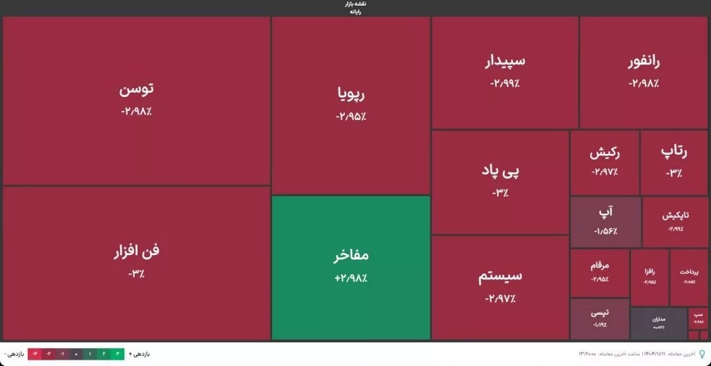 در پایان معاملات تنها ۴۵ نماد حدود ۷ درصد از بازار در محدوده مثبت قرار داشتند و ۶۷۵ نماد معامله شده در محدوده منفی بسته شدند، نشاندهنده فشار گسترده فروش در اکثریت سهامها بود.