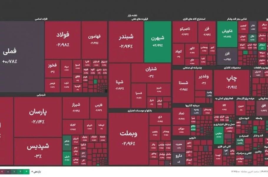 در پایان معاملات تنها ۴۵ نماد حدود ۷ درصد از بازار در محدوده مثبت قرار داشتند و ۶۷۵ نماد معامله شده در محدوده منفی بسته شدند، نشاندهنده فشار گسترده فروش در اکثریت سهامها بود.