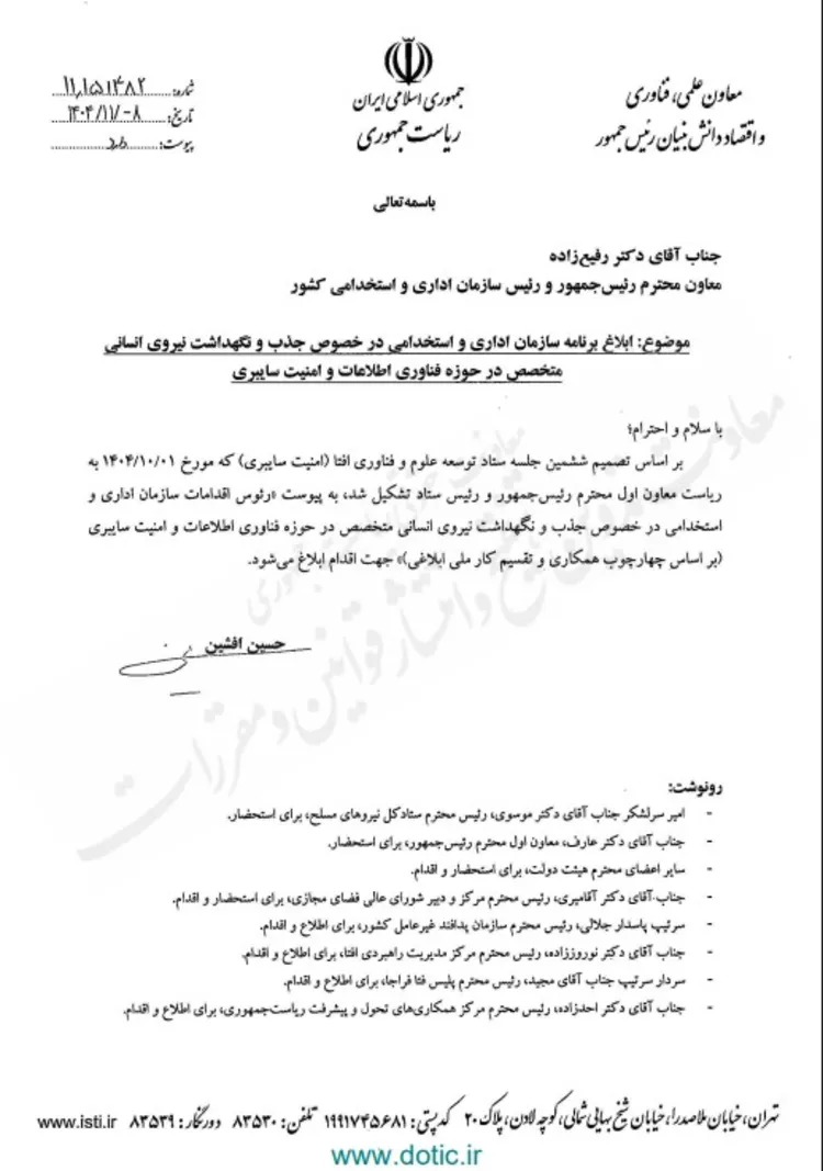 در ادامه متن این سند هم منتشر شده است. سند «تقسیم کار ملی در حوزه امنیت سایبری» در ششمین جلسه ستاد افتا (اول بهمن ماه) تدوین شده و هدف آن نگهداشت نگهداشت نیروی انسانى متخصص در حوزه فناوری اطلاعات و امنیت سایبری است.