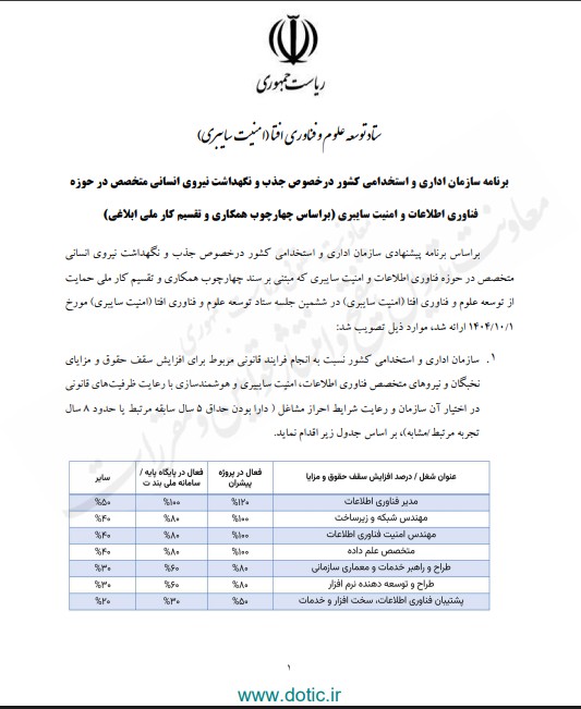 این سند در ششمین جلسه ستاد افتا (اول بهمن ماه) تدوین شده و هدف آن نگهداشت نیروی انسانى متخصص در حوزه فناوری اطلاعات و امنیت سایبری است