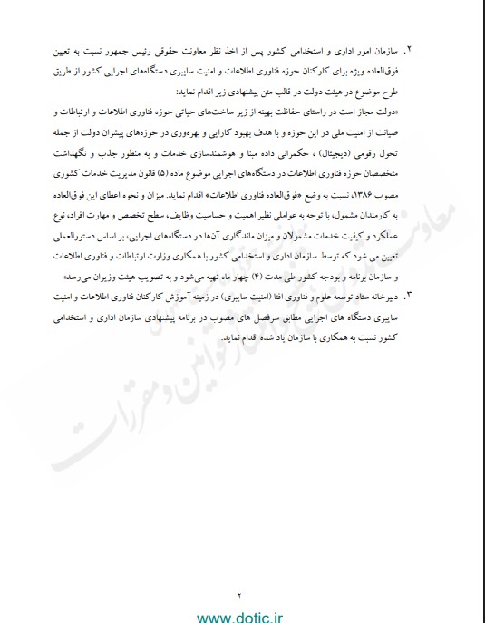 همچنین در بند دوم نوشته شده که سازمان اداری و استخدامی کشور پس از گرفتن نظر معاونت حقوقی رئیسجمهور، پیشنهاد برقراری «فوقالعاده فناوری اطلاعات» برای کارکنان حوزه فناوری اطلاعات و امنیت سایبری دستگاههای اجرایی را به هیئت دولت ارائه کند تا پس از تصویب، این مزایا بر اساس سطح تخصص، حساسیت وظایف، کیفیت عملکرد و ماندگاری نیروها پرداخت شود.
