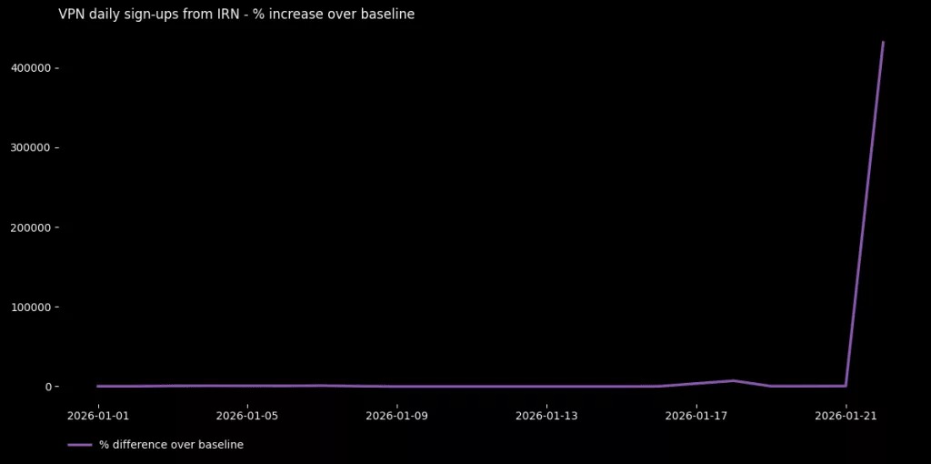 داده‌های Top10VPN نشان می‌دهد که اولین جهش در تاریخ ۲۸ دی رخ داده است؛ جایی که میزان تقاضا نسبت به میانگین ۲۸ روز پیش از شروع قطعی‌ها، رشدی ۱۸۷ درصدی را تجربه کرد.