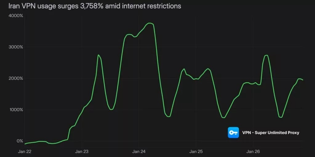 گزارش‌هایی که پلتفرم‌های ارائه دهنده خدمات وی‌پی‌ان منتشر کرده‌اند، نشان می‌دهد که پس از قطعی سراسری اینترنت، تقاضا برای ابزارهای دور زدن فیلترینگ در ایران به شکل بی‌سابقه‌ای افزایش یافته است. طبق این آمارها، تقاضا برای وی‌پی‌ان تا ۵۷۹ درصد نسبت به روزهای عادی افزایش داشته است.