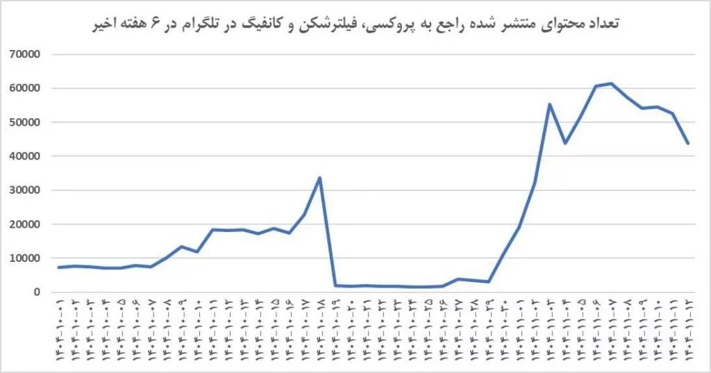 طبق این آمار، در بازه زمانی ۱۹ دی تا ۱۲ بهمن ماه، بیش از ۶۲۲ هزار محتوا با موضوع پروکسی، کانفیگ و فیلترشکن در کانال‌های تلگرامی به اشتراک گذاشته شده است.