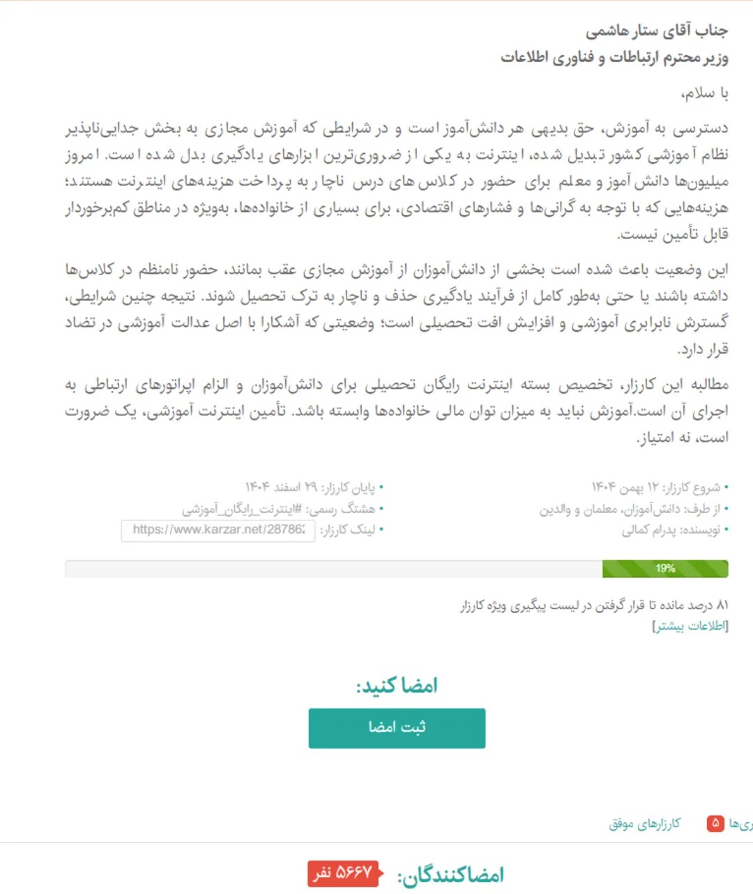 آنها این درخواست خود را با عنوان «کارزار اینترنت رایگان تحصیلی حق دانشآموزان است» در پلتفرم کارزار و خطاب به ستار هاشمی، وزیر ارتباطات و فناوری اطلاعات نوشتهاند.