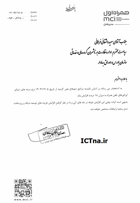همراه اول نیز با ارسال یک نامه رسمی به بورس اعلام کرده “به استحضار می رساند بر اساس تائیدیه مراجع ذیصلاح مقرر گردید از تاریخ 1404/12/05 نرخ بسته های دیتای اپراتورهای تلفن همراه به میزان ۱۸ درصد افزایش یابد”.