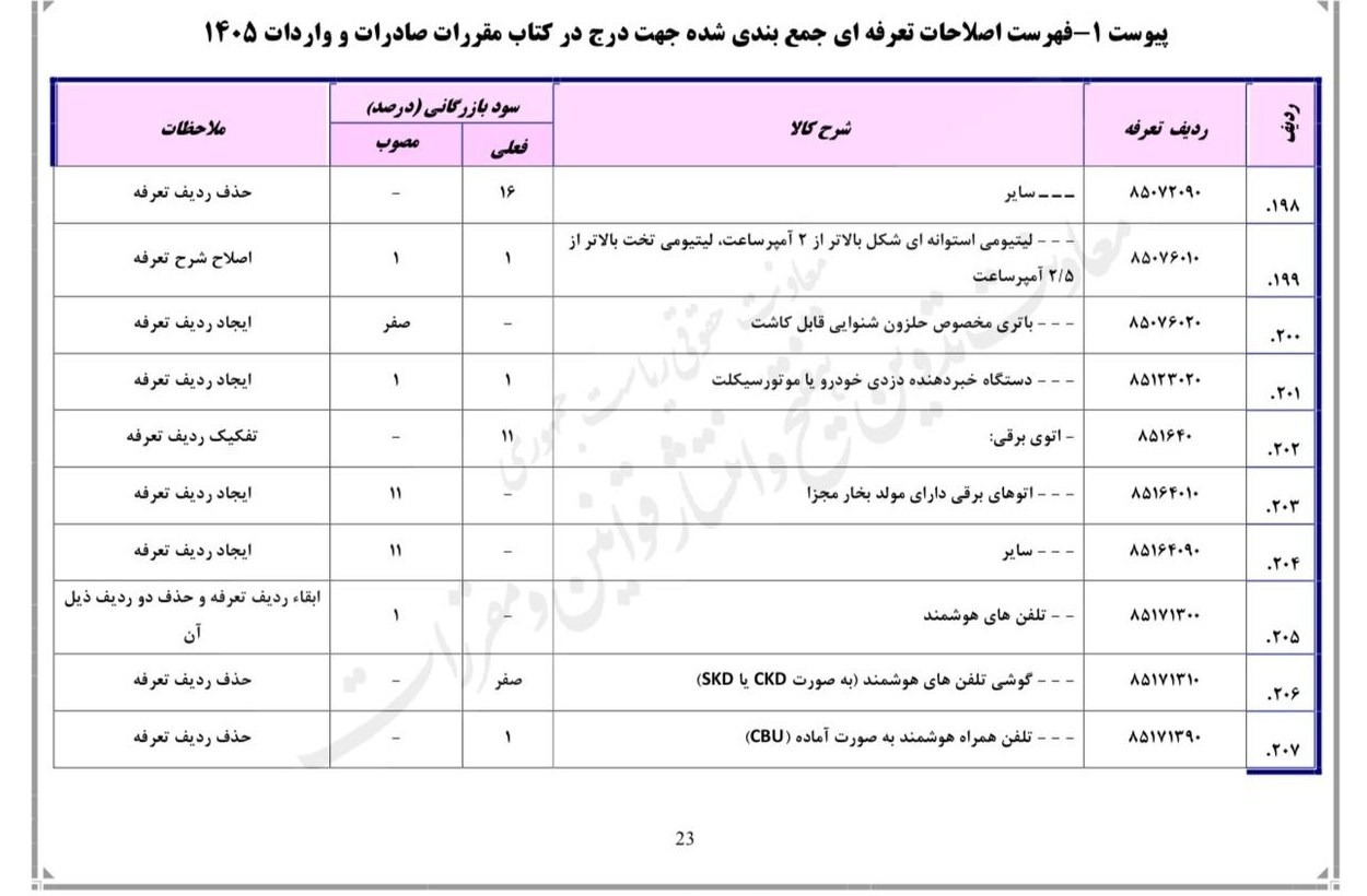 تغییر بحثبرانگیز در فهرست تعرفههای 1405