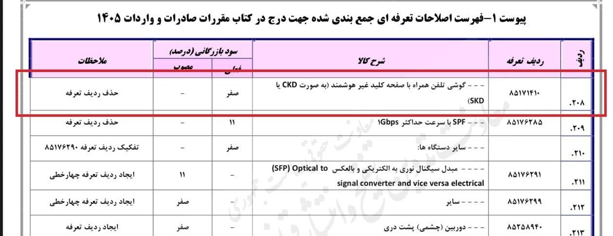فهرست اصلاحات تعرفهای سال 1405 که به زودی در هیئت دولت مصوبه و برای اجرا به گمرکات کشور ابلاغ خواهد شد، حاوی نکتهای سوال برانگیز برای صنعت تلفن همراه است. بر اساس این پیشنویس، ردیفهای مستقل واردات تلفن همراه به روش CKD و SKD حذف شده و تمامی گوشیهای وارداتی (اعم از کامل، نیمهمونتاژ و قطعات منفصله) در ردیف تعرفهای واحد 85171300 طبقهبندی میشوند.